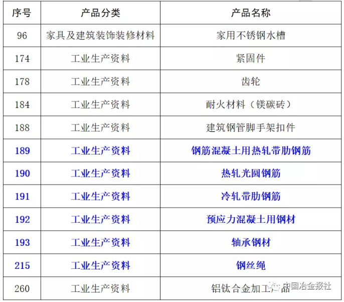 其中包括六种钢材产品和部分钢材相关产品(见下表)
